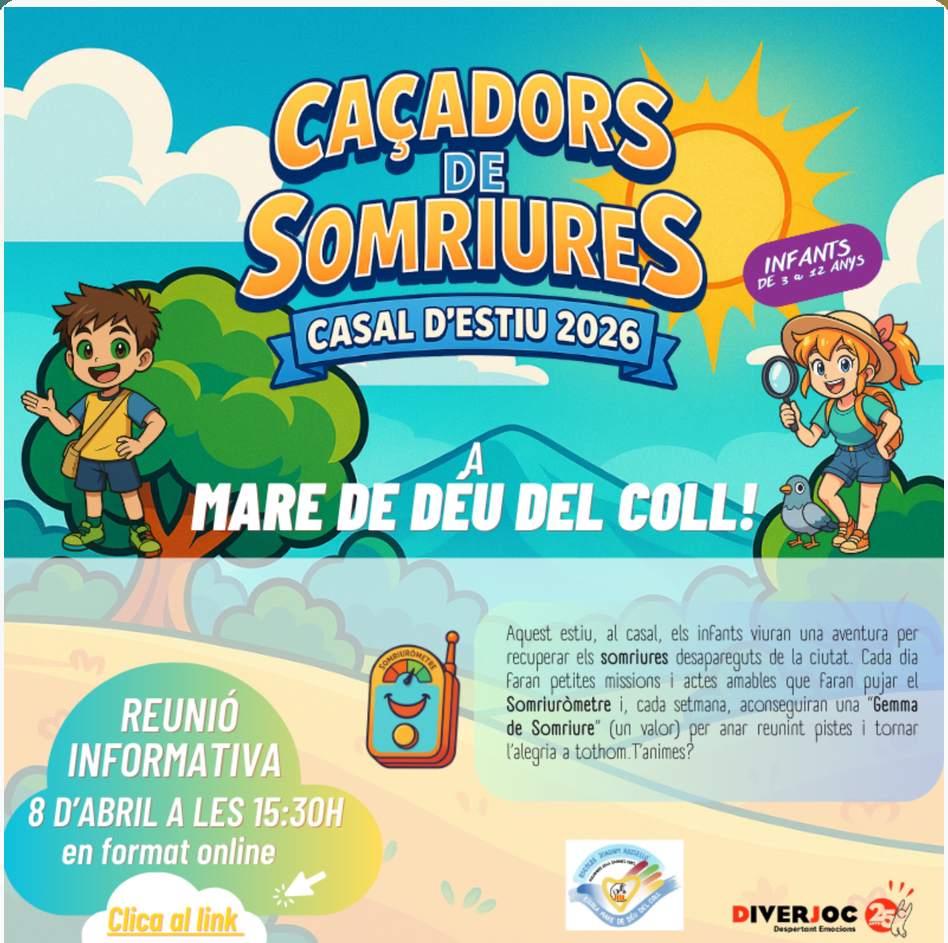 Aquest estiu, al casal, els infants viuran una aventura per recuperar els somriures desapareguts de la ciutat. Cada dia faran petites missions i actes amables que faran pujar el Somriuròmetre i, cada setmana, aconseguiran una “Gemma de Somriure” (un valor) per anar reunint pistes i tornar l’alegria a tothom. T’animes?